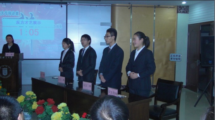 2011年12月2日,紧张激烈的第十一届大专辩论赛落下了帷幕。由10应化2班宇文成龙、10精细班安静、11化教班王静、11应化4班何其恒4位同学代表我院参加了此次大赛。本次大赛共有12支代表队参加,辩论赛分才艺展示、开篇立论、攻辩、攻辩小结、自由辩论、总结陈词、观众提问七个环节。比赛中,我院代表队以饱满的精神亮相。正反双方在辩论赛场上你来我往,慷慨陈词,将智慧、思辨的火花传递给了每一位观众,现场观众掌声不断。经过选拔赛、复赛、半决赛和决赛,我院代表队最终获得亚军,宇文成龙同学获得优秀辩手荣誉称号。