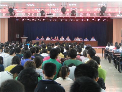 9月7日下午,yl88858永利中国在萃文厅隆重举行2012级开学典礼暨新生见面会。校长助理、学院院长王克太、党总支副书记、副院长张兴辉、副院长展惠英、责任教授李欣及部分教工、400余名新生参加了大会。