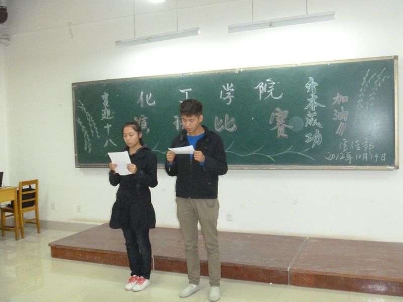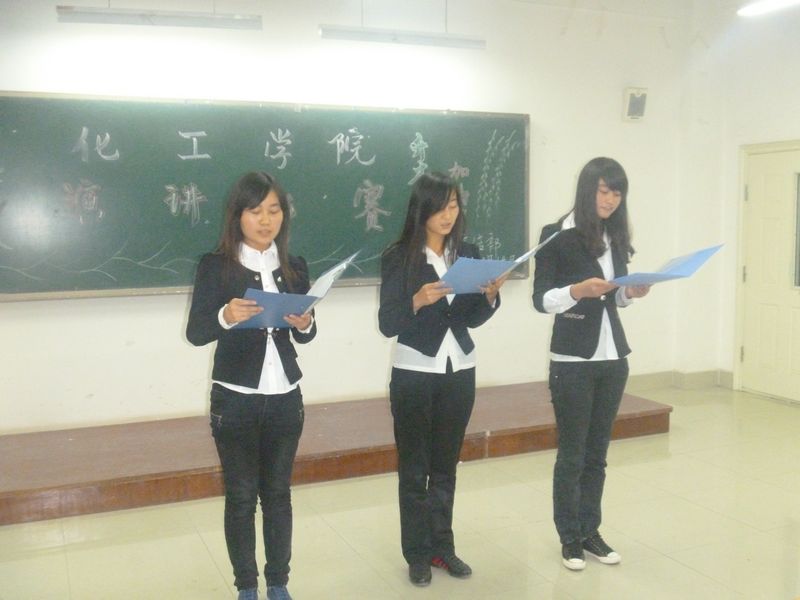 比赛过程中,选手们结合对党的方针政策的理解,对学校升本的信心,进行了声情并茂的演讲, 11级应化3班的邵累累同学结合对学校升本的信心、12级应化2班耿炜同学结合对党的政策的理解、11级应化3班车晓燕同学对十八大的认识、11级精化班代表队结合学校对学生的资助政策分别进行了演讲。经评委评审,邵累累获一等奖,耿炜、车晓燕、陈志敏等获二等奖,张玉荣、李洋、张英等获三等奖。