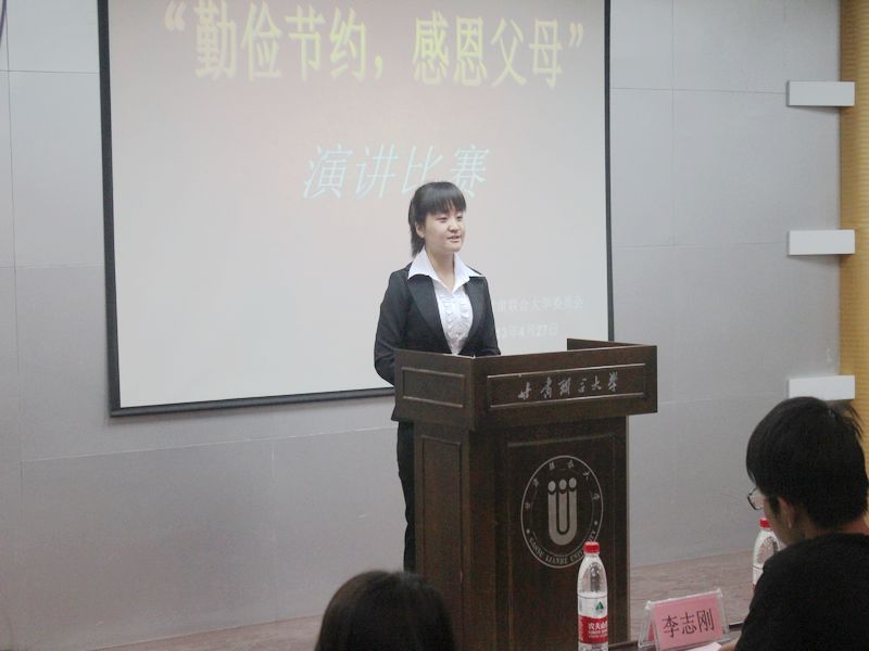 2013年4月27日晚,校团委、学生会在音乐楼学术报告厅举办 “勤俭节约感恩父母”演讲比赛。全校11个院、系选送的12位优秀选手参加了此次比赛。我院派出的12级应用化工技术3班刘玲同学荣获第三名。