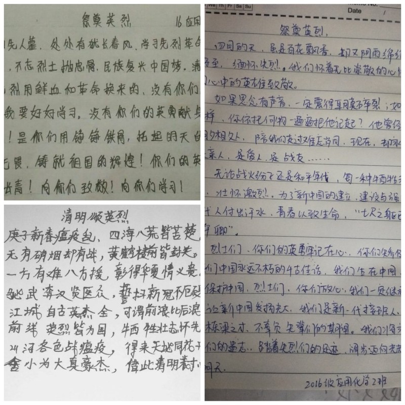 此外,清明节前同学们以写诗、制作手抄报、录制视频、创作书法作品等方式,传承和弘扬英烈精神,寄托对英烈的哀思和敬意,向在中国革命、建设,和牺牲在抗疫一线的同志致敬。
