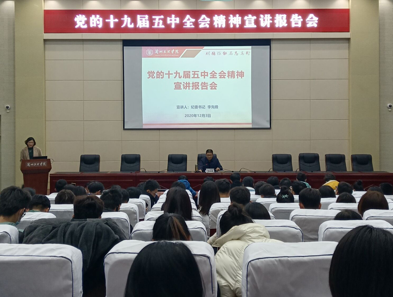 2020年12月3日下午,纪委书记李先锋在学术报告厅为师生作学习贯彻党的十九届五中全会精神专题宣讲暨“形势与政策”专题讲座。纪监审工会党支部全体党员、yl88858永利中国全体教职工、yl88858永利中国2018级全体在校学生200余人现场聆听。宣讲会由yl88858永利中国党总支书记贺志军主持。