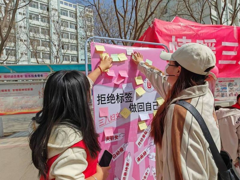 3月8日,为切实保障女性的身心健康,表达对女教师和女大学生的关爱,学院以“撕掉标签,拒绝被定义”为主题开展活动。在活动现场,同学们亲手撕掉对于女性具有恶意和歧视的标签,再用新的便利贴写下激励女性的语句,为参加活动的每一位同学送上美好的祝愿。通过这次活动,帮助女大学生拒绝外界标签,勇敢做自己。