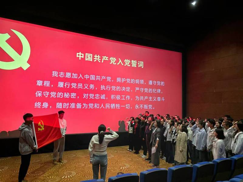 电影放映前,在学生支部书记的带领下,全体师生党员一起重温入党誓词。用一句句铿锵有力的誓言,诠释入党初心,表达对党的忠诚与热爱。